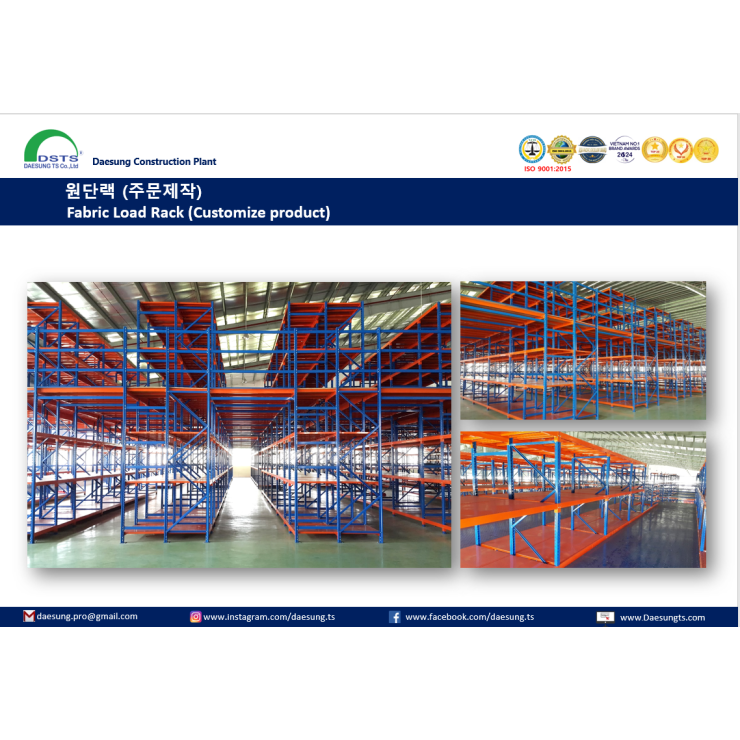 Chúng tôi – Daesung TS Co., Ltd – chuyên thiết kế, sản xuất và thi công hệ thống giá kệ lưu trữ vải cho các xưởng may, kho vải và nhà máy công nghiệp trên toàn quốc.