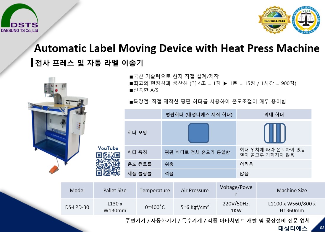 | DS-LPD-30 | L130 x W130 MM | 0~400oC | 5~6 Kgf/cm2 | 220V/50Hz, 1KW | L1100 x W560/800 x H1360 MM |