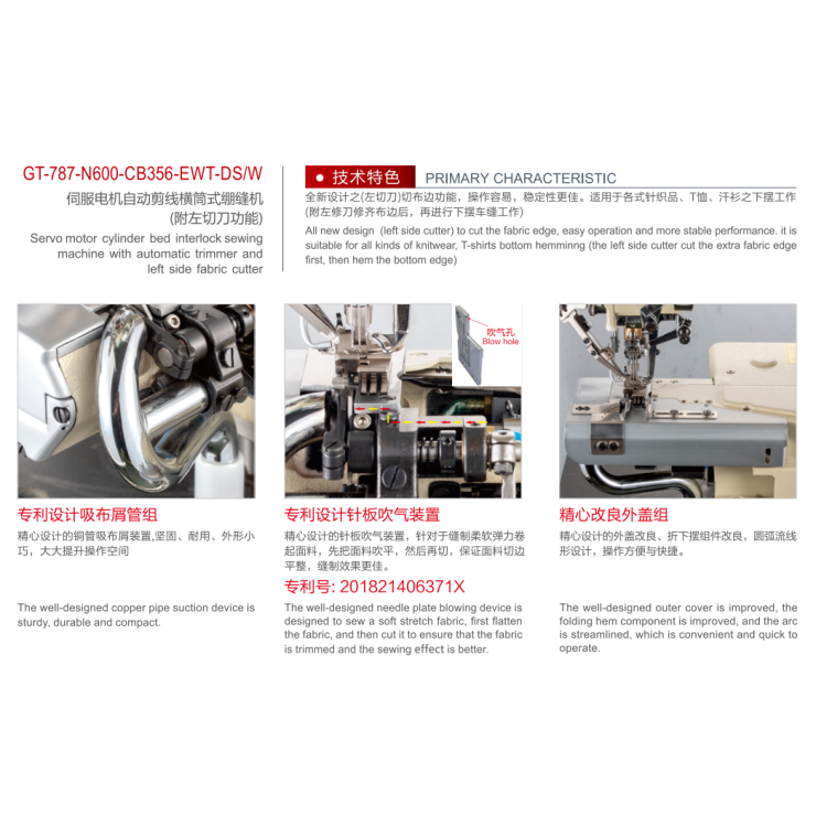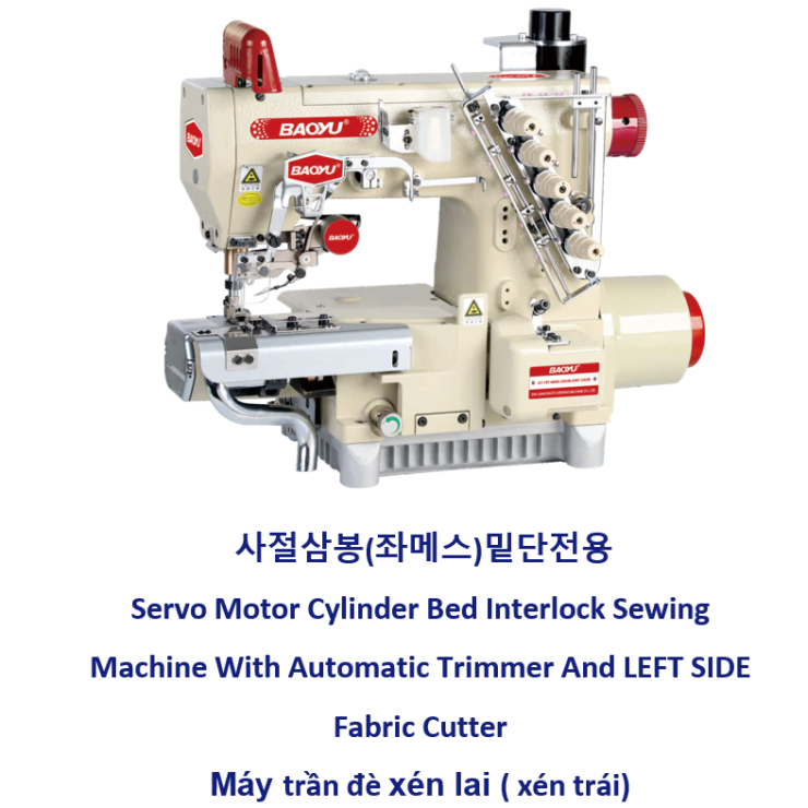 Máy được trang bị dao xén trái và hệ thống cắt chỉ tự động, giúp thao tác may nhanh chóng và chính xác.